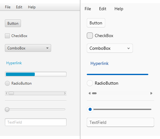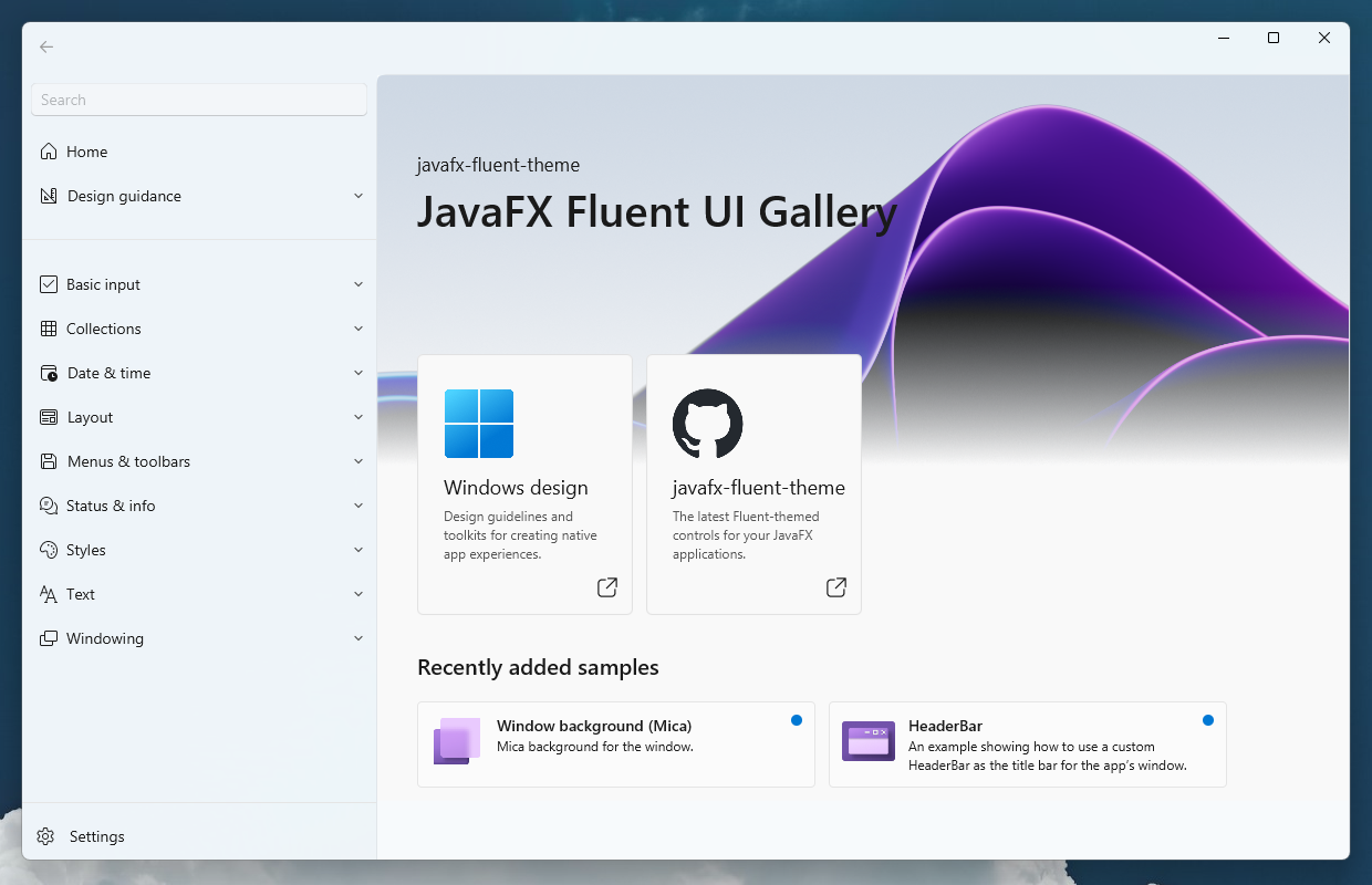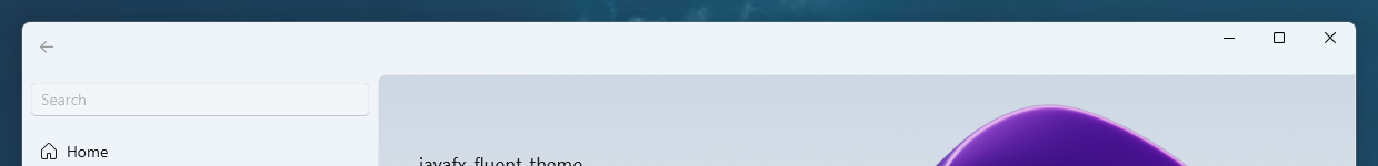 This is a custom theme for JavaFX to make your application look like a Windows 11 (WinUI) program. It replaces modena.css with styles that follow Microsoft's Fluent design language. In addition, you can apply Windows 11's Mica effect to your window, or override Windows' default window title bar for complete client-side decorations.